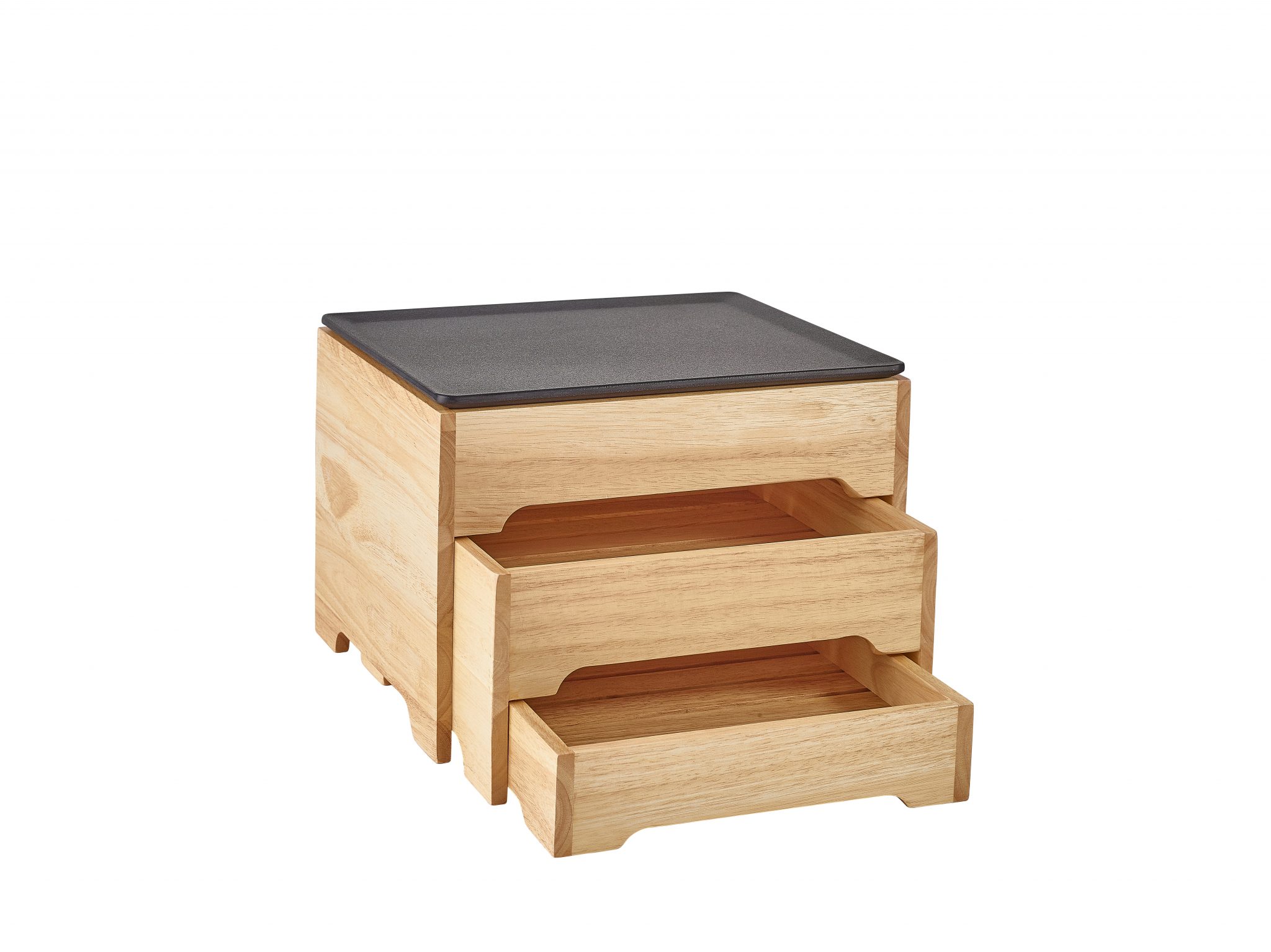 The GenWare Hevea Wood 3 Tier Display Stand is designed to elevate food presentation for any buffet or display within hotels, cafes or coffee shops. Crafted from durable hevea wood, it ensures longevity and resilience, ideal for the demands of a bustling setting. Each drawer provides ample display space for pastries, cakes and breads, offering both functionality and visual appeal. When not in use, the drawers conveniently retract, saving valuable space for storage. The display stand also has a GN 1/2 footprint which ensures consistency with other GN buffetware.
